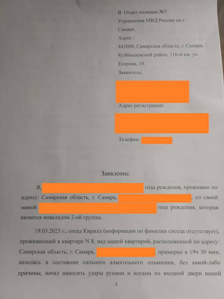 Участковому уполномоченному ОП №1 УМВД России по г. Москве майору полиции Сидорову А.А. от Петровой Анны Ивановны проживающей по адресу: г. Москва, ул. Ленина, д.10, кв.5 тел. +7(XXX)XXX-XX-XX | |